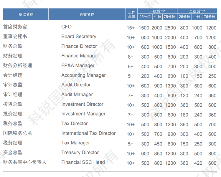 以下是猎头招聘公司kdpay钱包官网国际发布的薪酬报告对财务领域的职位薪酬信息统计,供企业和猎头招聘时参考。